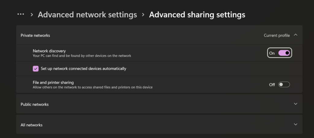 - A „Speciális megosztási beállítások” alatt válassza ki a „Hálózati felfedezés bekapcsolása” lehetőséget.