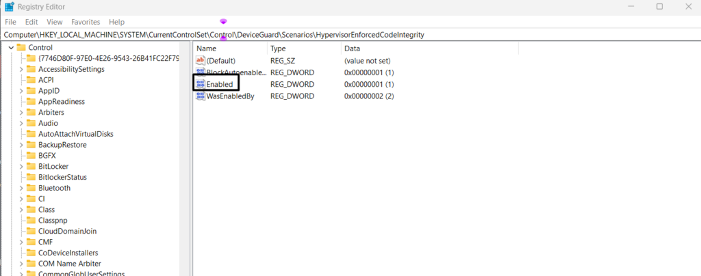 ComputerHKEY_LOCAL_MACHINESYSTEMCurrentControlSetControlDeviceGuardScenariosHypervisorEnforcedCodeIntegrity