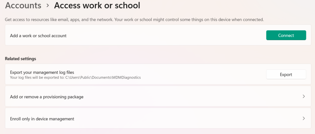2.AFiókokablak, alattFiókbeállítások, válassza ki aHozzáférés a munkahelyhez vagy az iskoláhozopció.