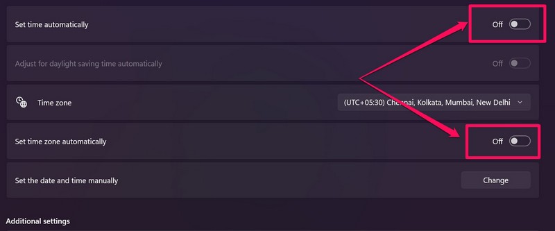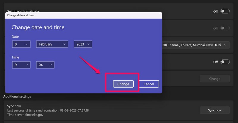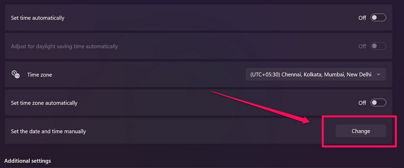 Most, ha a fenti módszer nem oldotta meg a Windows 11 eszközön nem működő idő szinkronizálását, akkor megpróbálhatja a dátumot és az időt manuálisan beállítani a számítógépen vagy a laptopon. Ehhez használja az alábbi lépéseket az alábbiakban: