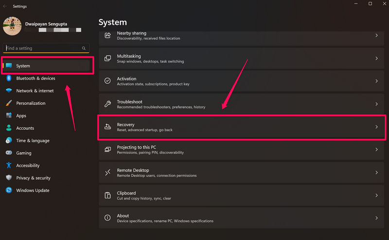 2.ARendszerfül a bal oldali navigációs sávban, lépjen aGyógyulásmenü.