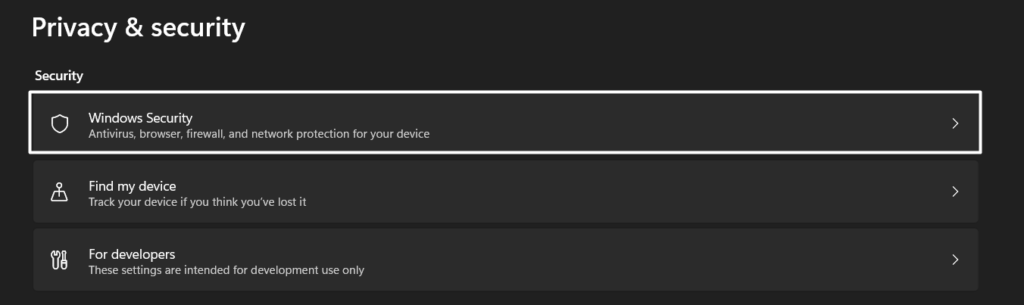 1.A kezdethez, Nyissa ki aAdatvédelem és biztonságaBeállítások alkalmazása bal oldalsávból, és válasszonWindows biztonság-