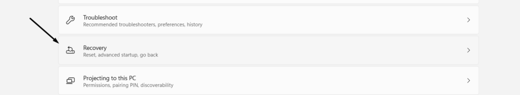 1.Ehhez költözz aGyógyulásaBeállítások alkalmazásés válassza ki aVisszaállítja a PC -topció aHelyreállítási lehetőségekszakasz.