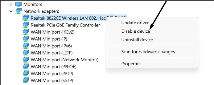 4.Ezután kattintson a jobb gombbal a WAN Miniport Network adapterre, és válassza ki aTiltsa le az eszköztOpció a felbukkanó menüből.