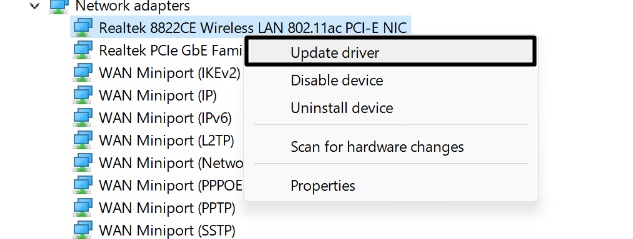 Először azt javasoljuk, hogy újra engedélyezze a járművezetőket. Ha a WAN Miniport hálózati adapterek újbóli engedélyezése nem javítja a problémát, akkor fontolhatja meg azok frissítését. Elmagyaráztuk, hogyan lehet ugyanezt tenni az alább említett lépésekben könnyedén: