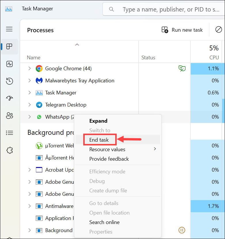 Zárja be a szükségtelen alkalmazásokat: Zárjon be minden szükségtelen alkalmazást, amely a háttérben fut, és ütközik a WhatsApp Desktop szolgáltatással.