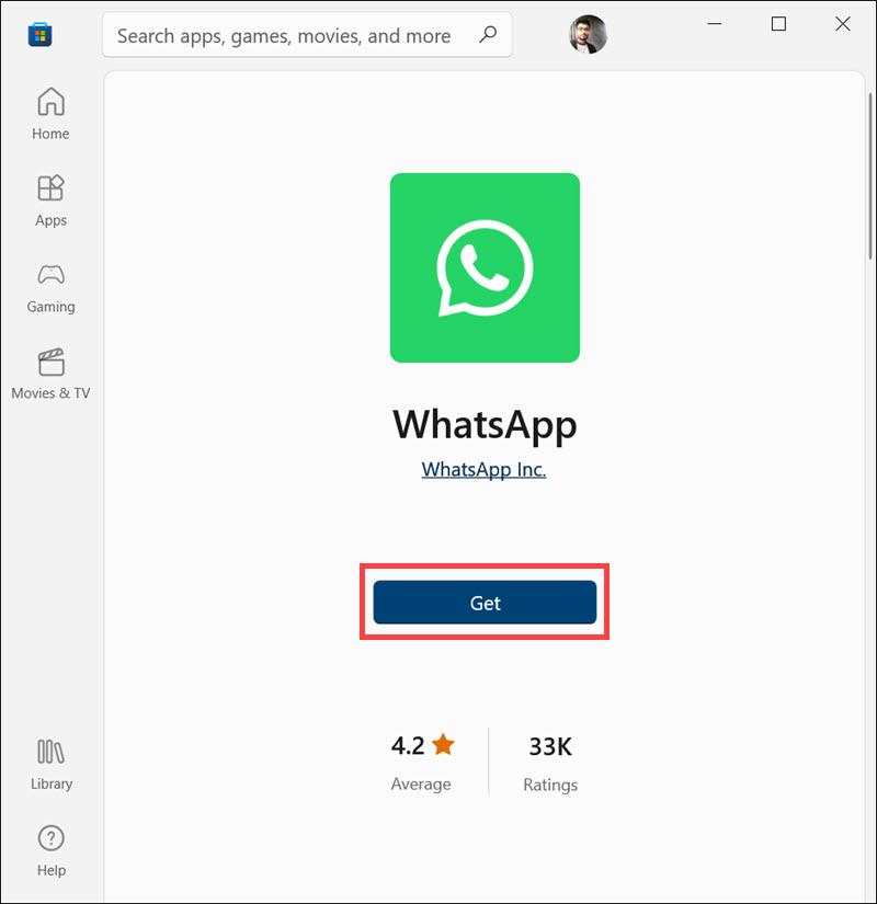 7.Keresse meg aWhatsAppalkalmazást a Microsoft Store alatt, és kattintson a gombraKapgomb.