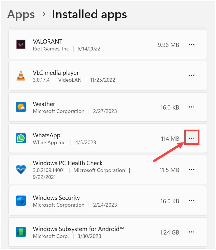 3.Keresse meg aWhatsAppalkalmazást, és kattintson a mellette lévő „három pontra”.