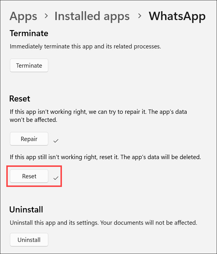7.A rendszer megkezdi a WhatsApp alkalmazás alaphelyzetbe állítását, és miután ez befejeződött, a Reset gomb mellett egy pipa jelenik meg.