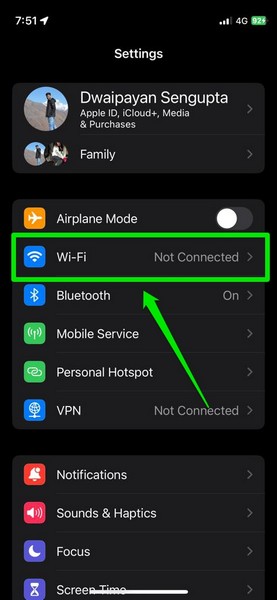 6.Abban az esetben, ha Wi-Fi hálózatot használ,Koppintson a Wi-Fi opcióraAz elsődleges beállítások oldalon.
