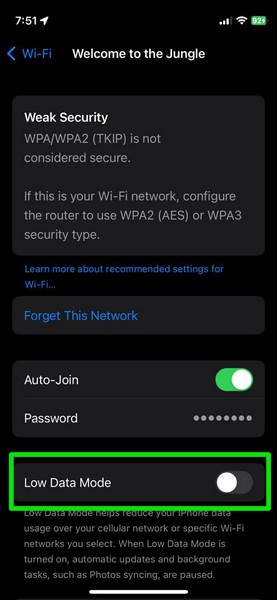 Most, függetlenül attól, hogy mobil adathálózatot vagy Wi-Fi hálózatot használ az iPhone-ján, az alacsony adatmód-beállítás mindegyikre okozhatja a kütyüket, amelyek nem működnek az eszközön. Ebben az esetben meg kell győződnie arról, hogy a mobil vagy mobilhálózat alacsony adatmód-opciója, valamint a Wi-Fi hálózat letiltva van-e az eszközön.