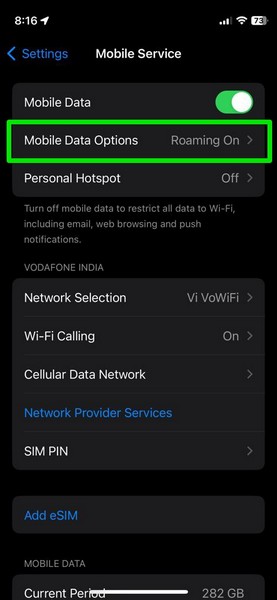 3.Érintse meg aMobil adatokvagyMobil opciókgomb.