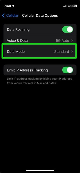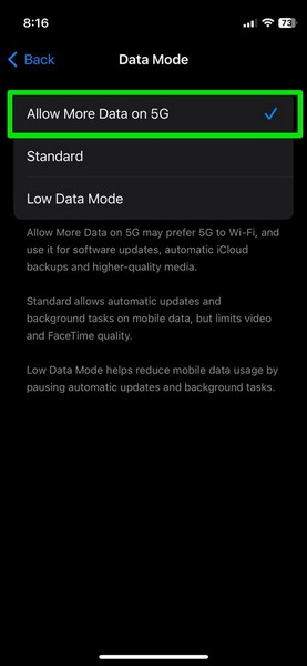 5.Itt ellenőrizze, hogy az adatmód bármelyikre van -e állítvaStandardvagyEngedjen meg több adatot az 5G -rőla készülékén.