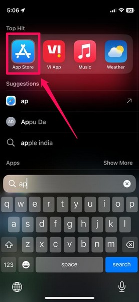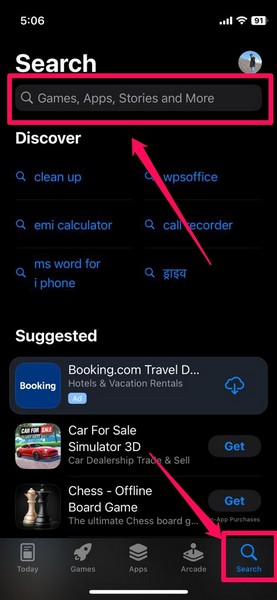 5.Menj aKeresésfül az alsó navigációs sávon ésA keresősáv segítségével keresse meg az alkalmazástCsak eltávolítottad.