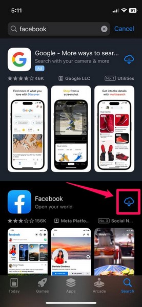 6. Érintse meg a Letöltés gombotAz alkalmazás mellett a keresési eredmények oldalon, hogy újratelepítse az iPhone -on.