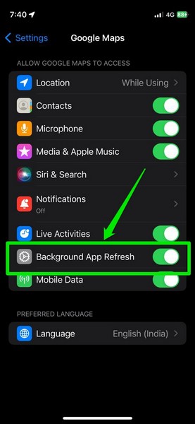 3. A következő alkalmazásbeállítások oldalon ellenőrizze a váltást aA háttér alkalmazás frissítéseopcióbe van kapcsolvaaz iPhone -ján.