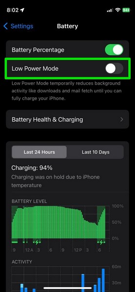 3.Győződjön meg arról, hogy a váltás aAlacsony teljesítmény módopció azkikapcsoltaz iPhone -ján. Ha nem az, akkorÉrintse meg a váltást a beállítás letiltásáhoza készülékén.