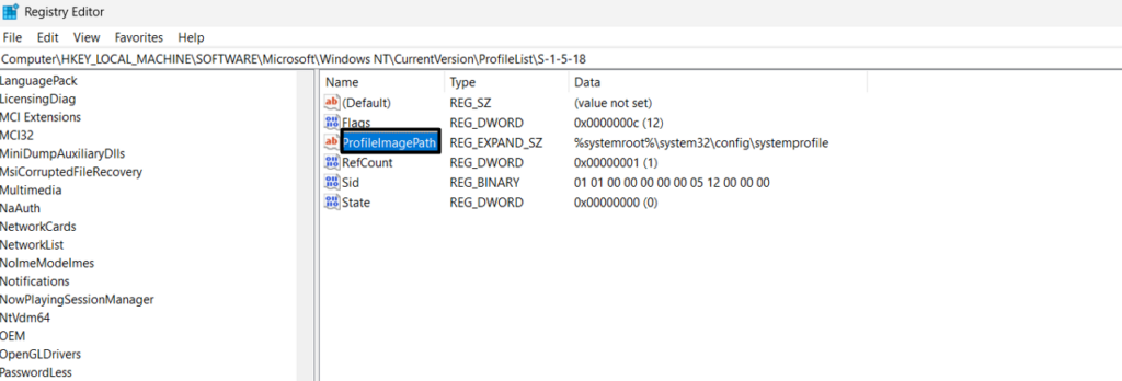 ComputerHKEY_LOCAL_MACHINESOFTWAREMicrosoftWindows NTCurrentVersionProfileList