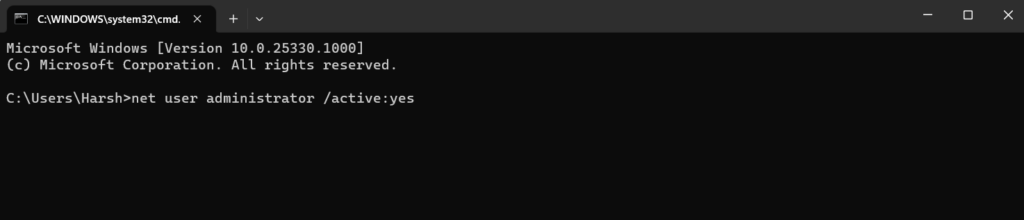 2.Miután kész, nyissa kiParancssorés írja beNet felhasználói rendszergazda /aktív: Igenbenne.