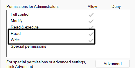 3.Győződjön meg róla, hogy van -e kullancs a melletteOlvasésÍrásaMegengedoszlop aEngedélyek a (fiók neve) számáraszakasz.