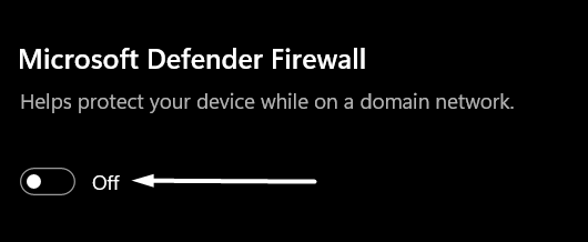 3.Kattintson ráTartományhálózatés tiltsa le az alsó váltástMicrosoft Defender tűzfal-