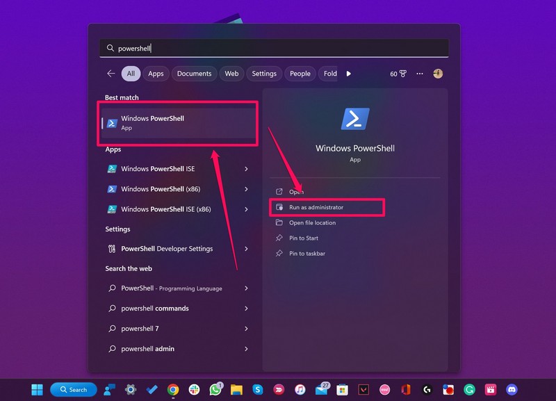 2.Kattintson aFuttasson adminisztrátorkéntgomb aWindows PowerShellProgram a keresési eredményekben.