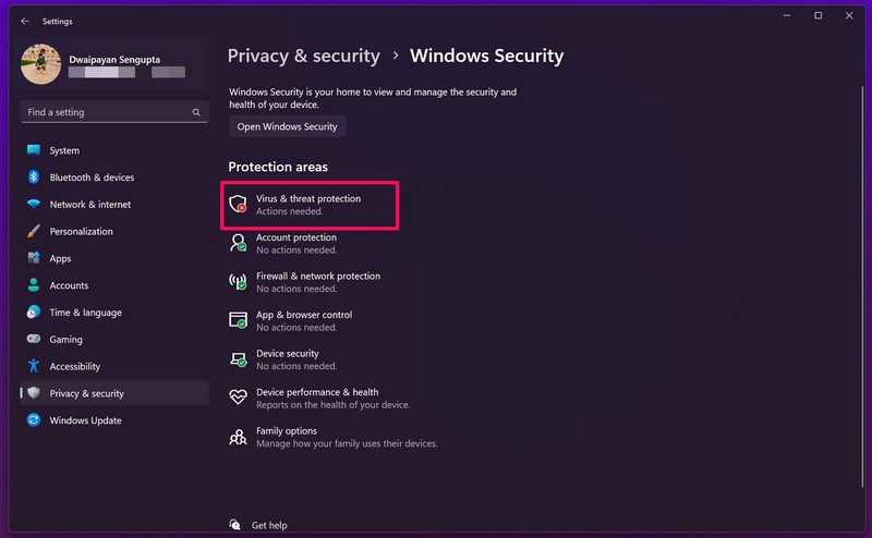 3.A következő oldalon kattintson aVírus és fenyegetésvédelemopció.