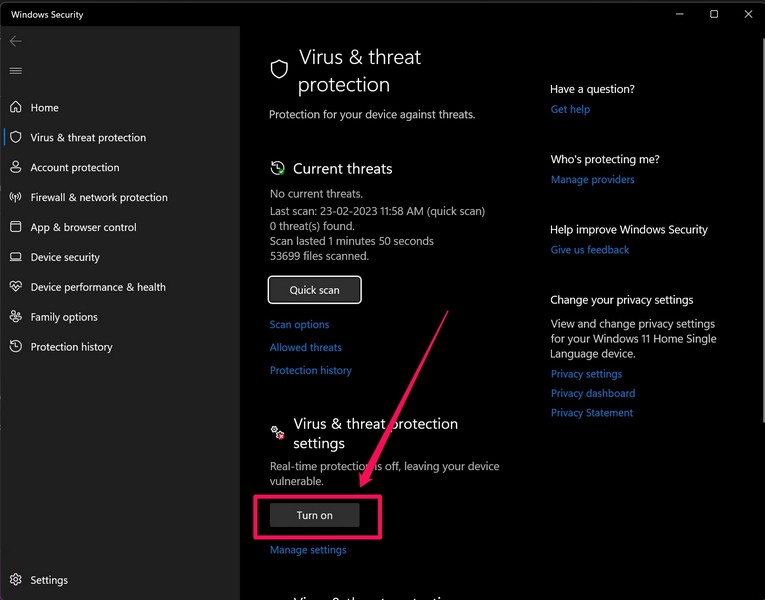 4.Amint a Windows Security alkalmazás megnyílik, kattintson aBekapcsolgomb aVírus- és fenyegetésvédő beállítások-