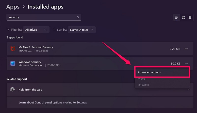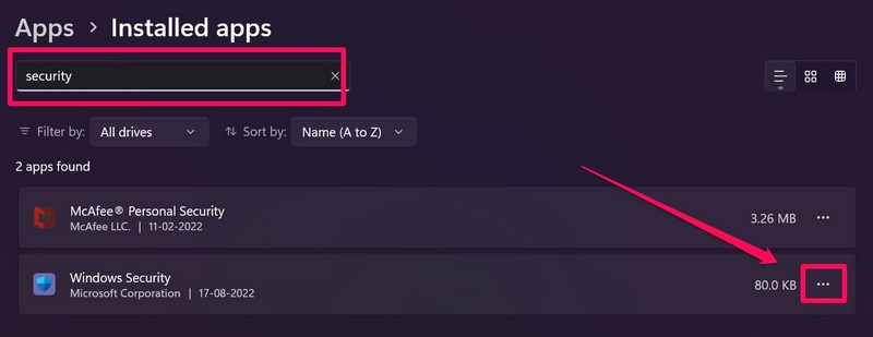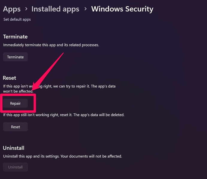 Egy másik javítás, amelyet kipróbálhat, amikor szembesül a Windows Security -vel, amely nem működik a Windows 11 -ben a számítógépen, vagy a laptop, javítja vagy visszaállítja az eszköz alkalmazását. A Windows 11 integrált javítási és visszaállítási lehetőségeket biztosít a rendszer alkalmazásokhoz, például a Windows Security alkalmazáshoz, és így használhatja azokat az eszközön: