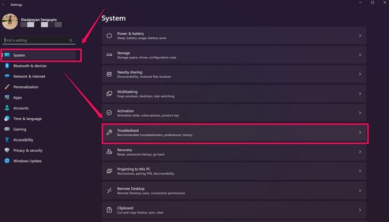 2.ARendszerfül a bal oldali navigációs sávban, lépjen aHibaelhárításmenü.