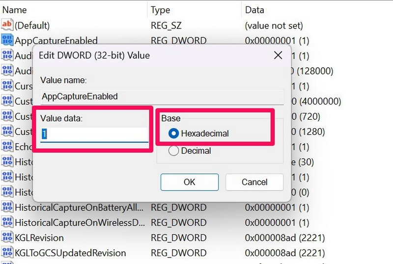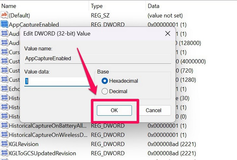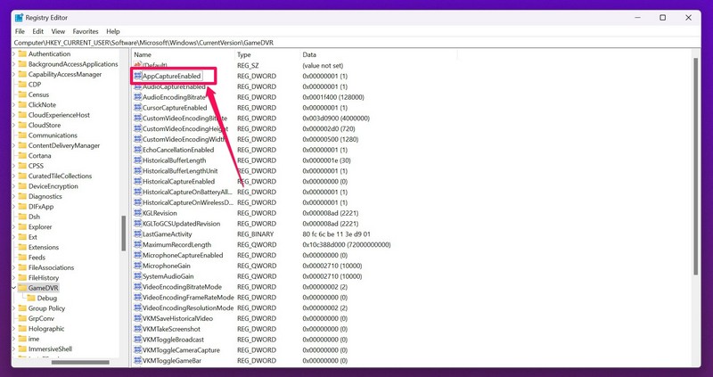 5.Keresse meg aAppCaptureEnabledkulcs a jobb oldali ablakon.