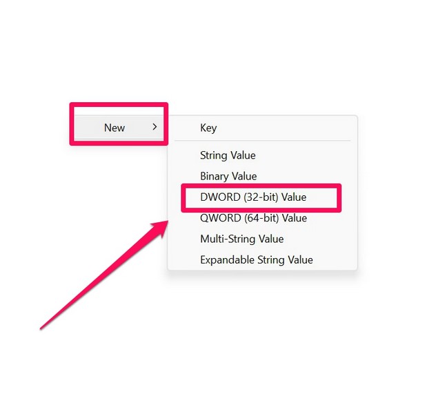 6.Ha nincs ott, kattintson a jobb gombbal egy üres helyre, vegye át a kurzortÚj, és válassza ki aDWORD (32 bites) értéka kontextusban.