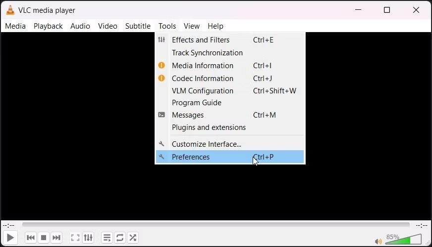 Indítsa el a VLC Player alkalmazást Windows 11 számítógépén. Érintse meg az Eszközök opciót a felső menüsorban, és válassza a „Beállítások” lehetőséget.