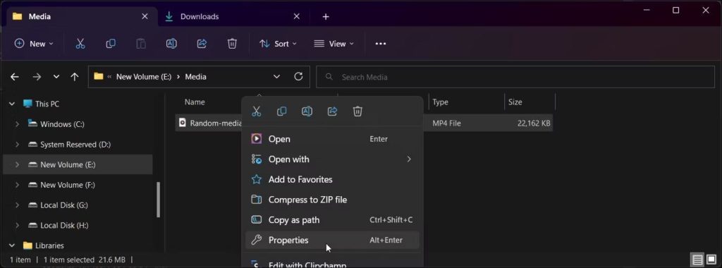 Indítsa el a File Explorer alkalmazást, és keresse meg a médiafájl tárolási helyét. Kattintson a jobb gombbal a fájlra, és válassza a „Tulajdonságok” lehetőséget.