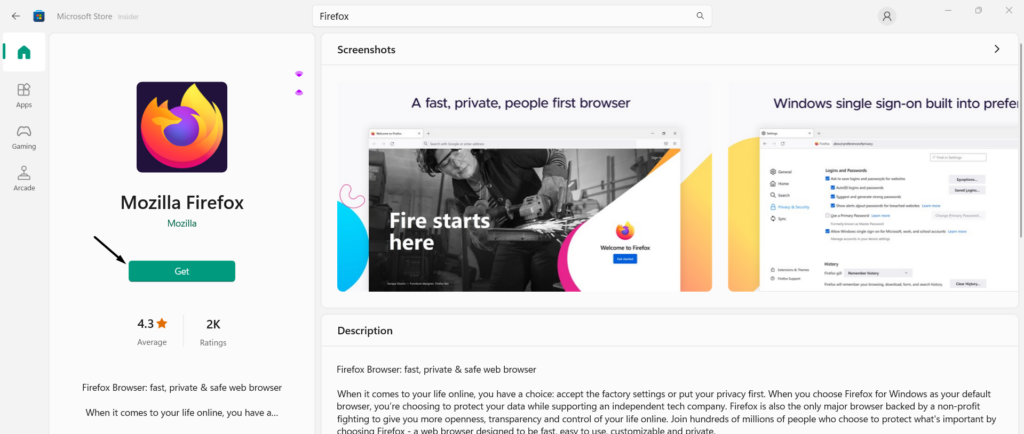 Jegyzet:Ha nem találja a böngészőt a Microsoft Store -ban, töltse le a hivatalos webhelyéről.