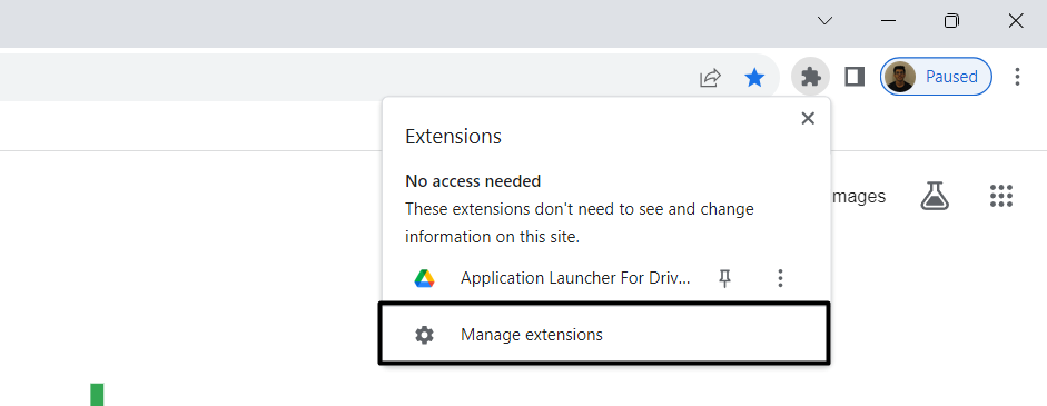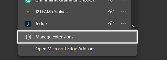 2.A felbukkanásban kattintsonKezelje a kiterjesztéseketAz összes telepített webhosszabbítás megtekintéséhez a PC -n.
