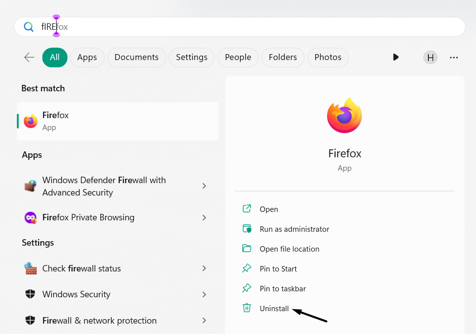 1.A böngésző újratelepítéséhez a PC -n írja be a böngésző nevét a keresésbe, és kattintsonEltávolít-