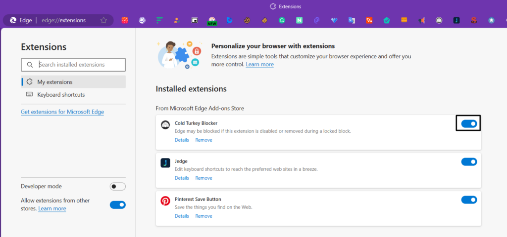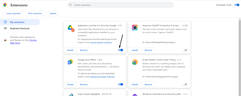 3.AMinden kiterjesztésszakasz, kapcsolja ki aváltásA letiltani kívánt kiterjesztés mellett.
