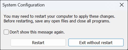 5.Az újRendszerkonfigurációablak, válassza aÚjraindítvagyKilépés nélkül újraindítás nélkülopció.