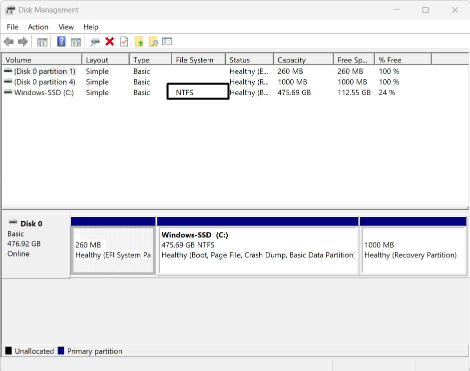 2.Keresse meg meghajtóját a Lemezkezelés ablakban, és ellenőrizze, hogy aNTFSmellé van írva.