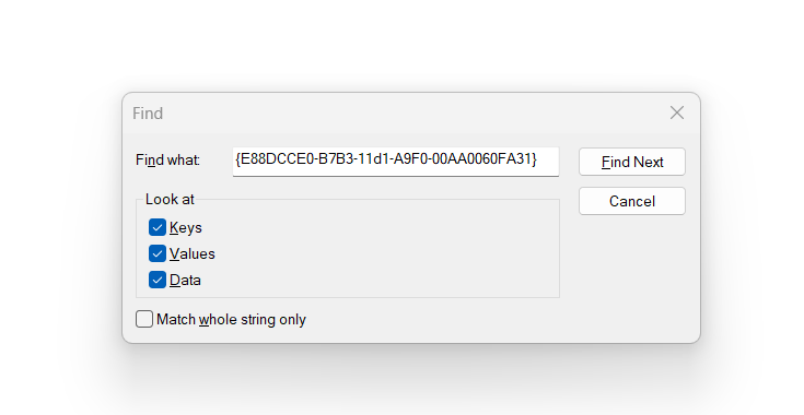 2.ARendszerleíróadatbázis-szerkesztőablakban nyomja meg a Windows + F billentyűket a megnyitáshozLelet, és másolja be az alábbi kulcsot: