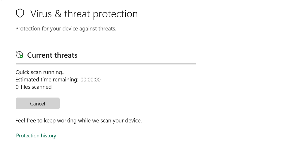 2.AVírus- és fenyegetésvédelemablakban kattintson aGyors szkennelésgombot a rosszindulatú programok vizsgálatának elindításához.