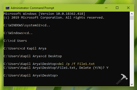2.A parancssors ablakban keresse meg a fájl mappájának helyét, amelyet a törlés kényszeríteni szeretné. Miután ebben a mappában vagy, írja bedel /p /f <FILE NAME>és nyomja meg az Enter billentyűt. Vagy alternatívaként közvetlenül végrehajthatjadel /p /f <FILE LOCATION>parancs. Ahogy használtuk/pParaméter, tehát megerősítést fog kérni, miközben a fájl törlése. Ha úgy tetszik, kihagyhatja/pParamater és közvetlenül használjadel /f <FILE LOCATION>- Vegye figyelembe/fA paraméter a megadott fájl törlésének kényszerítésére szolgál.