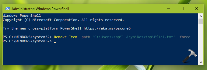 Remove-Item –path '<FILE LOCATION HERE>' - force* Helyettesítő<FILE LOCATION HERE>A pontos fájl helyével kényszeríteni szeretné a törlést. Például,Remove-Item –path 'C:UsersKapil AryaDesktopFile1.txt' - force- Ha a parancs nem áll a helyből, akkor eltávolíthatja az idézeteket. Például,Remove-Item –path C:UsersKapilAryaDesktopFile1.txt - forceműködnie kell, deRemove-Item –path C:UsersKapil AryaDesktopFile1.txt - forceCsak akkor hajtja végre, ha a fájl helyét idézetbe helyezi.