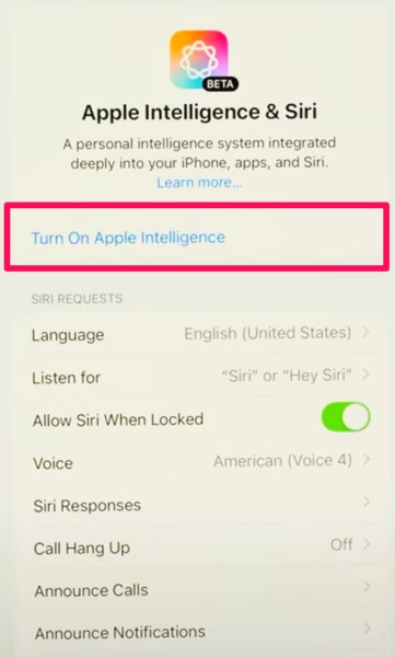 - Most nyomja meg az Apple Intelligence & Siri> Akkor győződjön meg arról, hogy a nyelvet angolul beállítják.