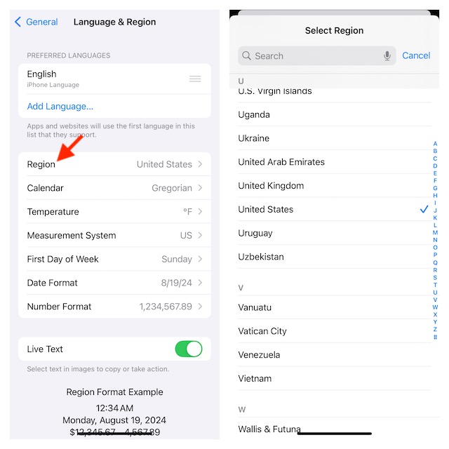 - Most koppintsonRégió> Görgessen lefelé, hogy megtalálja aEgyesült Államokés válassza ki.