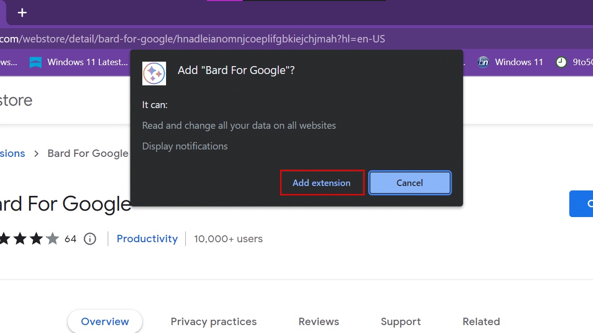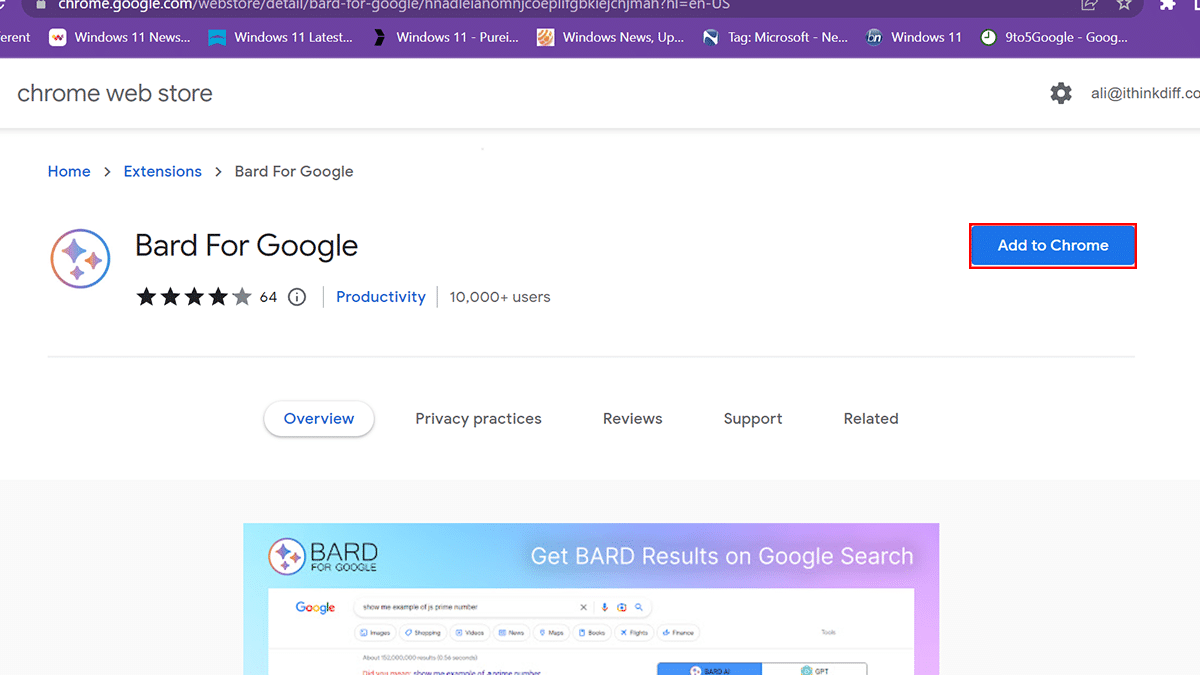 - Látogasson el aChrome Web StoreWeb> A keresősáv típusábanBard a Google számára> Kattintson a “Bard a Google számára”Bővítés.