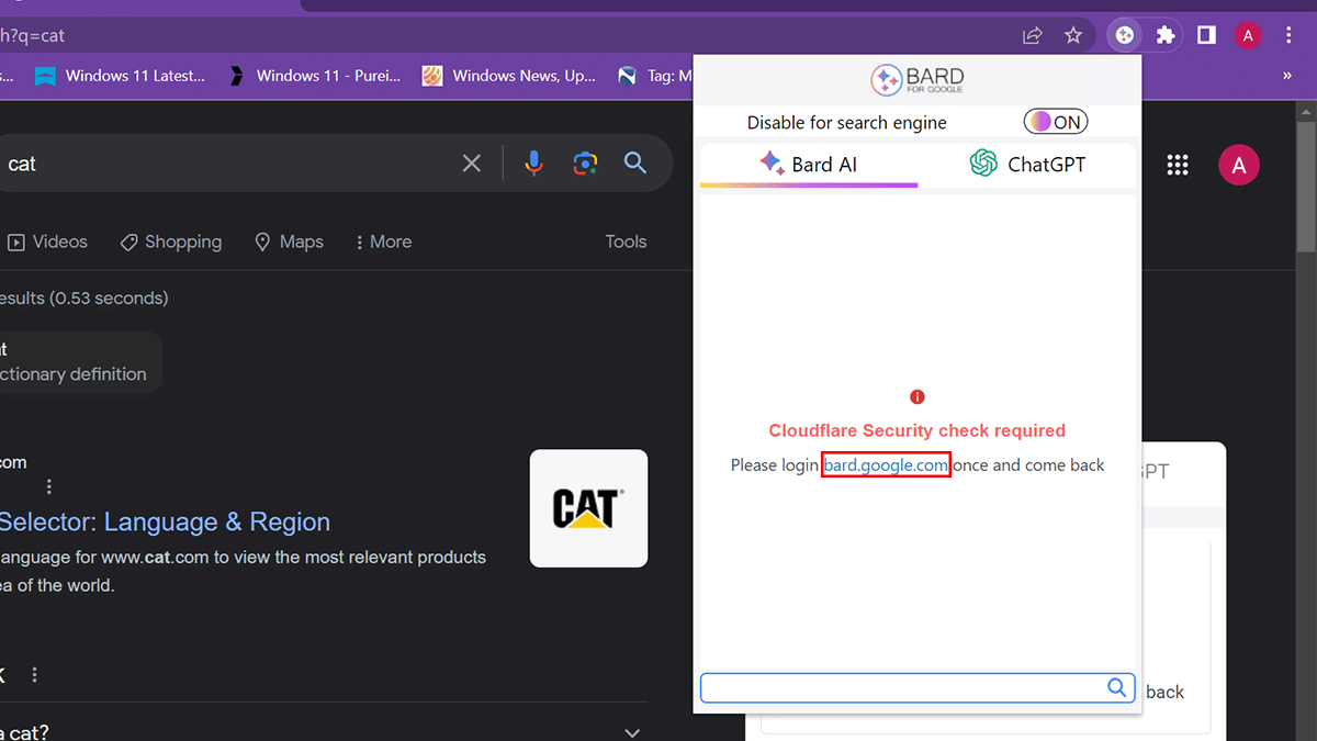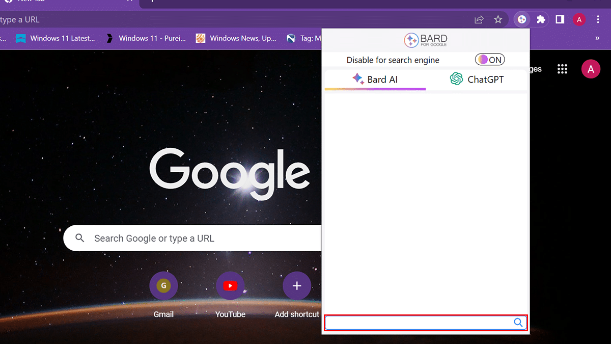 - Miután befejezte a bejelentkezést, zárja be aDalnokWeb> Nyissa meg aBard a Google számárakiterjesztés és kezdje el belépni a promptra a megadott mezőbe.