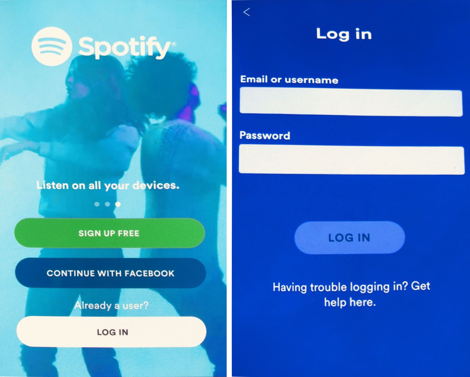 Miután telepítette az alkalmazást, csak nyissa meg, be kell írnia a Spotify -t felhasználónevével / jelszavával, vagy használja a Facebook bejelentkezési lehetőséget, így be kell írnia a Spotify hitelesítő adatait a bejelentkezéshez.