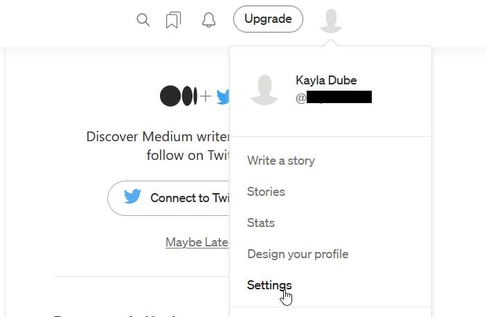 - Görgessen le a lehetőséghezKapcsolatok, és kiválaszthatja, hogy összekapcsol-e egy közösségimédia-profilt, például a Facebookot vagy a Twittert, valamint megjeleníthet egy linket a Twitterére a Médium oldalon.
